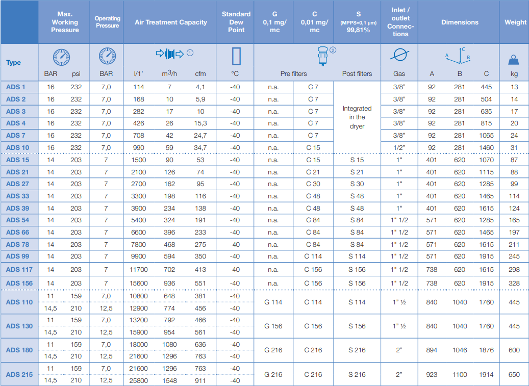 Máy sấy hấp thụ Ceccato ADS sẽ loại bỏ hơi nước có khả năng ngưng tụ trong hệ thống khí nén của bạn và gây ra hư hỏng. Những máy sấy này sử dụng vật liệu hấp thụ được gọi là “chất làm khô” để hấp thụ và loại bỏ độ ẩm từ khí nén. Với phương pháp này, chúng ta có thể đạt PDP <3 ° C (-20 ° C , -40 ° C hoặc -70 ° C.). Phạm vi này cũng được sử dụng khi nhiệt độ môi trường xuống dưới điểm đóng băng, để tránh đóng băng trong đường ống và các ứng dụng. Dòng máy sấy hấp thụ ADS là thường được sử dụng trong ngành công nghiệp hóa chất, thực phẩm và dược phẩm và bất cứ khi nào PDP <3 ° C được yêu cầu.